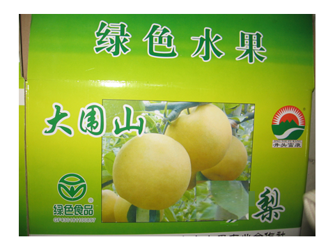1、外在感官特征:大围山梨果实圆形或扁圆形,果形端正,果较大,果实横径≥60毫米,单果重200~500克。成熟后黄绿色或黄褐色,有光泽。果肉质乳白,质地细腻,脆嫩无渣,清香爽口、果心小皮薄、可食率高,汁液多、风味好。符合NY5011-2006的要求。 2、内在品质指标:大围山梨品质好,营养价值高。据测定:果实硬度(kg/平方厘米)≥4kg/平方厘米,可溶性固形物(%)≥11,总糖(%)≥7,总酸量(%)≤0.20,固酸比≥60:1,维生素C≥4mg/100g。 3、符合《NY5011-2006无公害食品仁果类水果》标准的安全要求。